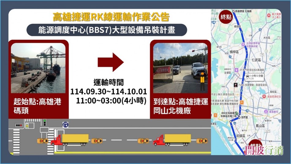 配合「高雄捷運岡山路竹延伸線」工程進度,捷七能源調度中心大型電力設備即將進場並辦理運輸作業,提醒用路人注意行車安全!運輸作業資訊,作業地點:高雄港碼頭→高雄捷運岡山北機廠