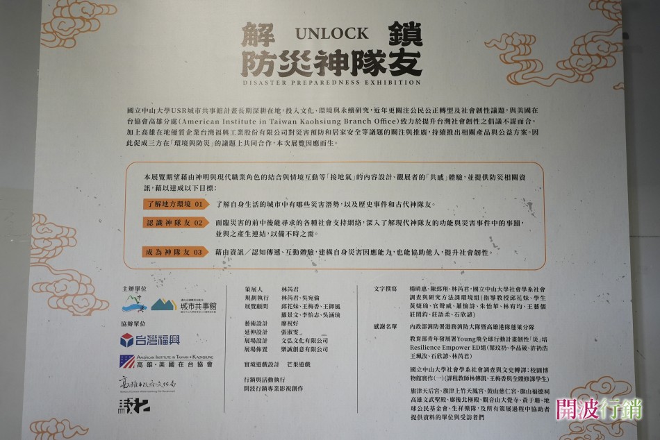 「解鎖!防災神隊友」互動展由中山大學USR「城市共事館」計畫推動,即日起至11月23日在駁二蓬萊B6倉庫展出。展覽以信仰文化、現代職業角色與遊戲互動,邀請民眾一起發掘生活中潛藏的「神隊友」,國立中山大學攜手高雄市文化局、台灣福興、美國在台協會高雄分處,推出大型互動展覽「解鎖!防災神隊友」。高雄市長陳其邁說,展覽以多元情境模擬,讓民眾深入了解防災知識,專業行銷企劃與活動執行